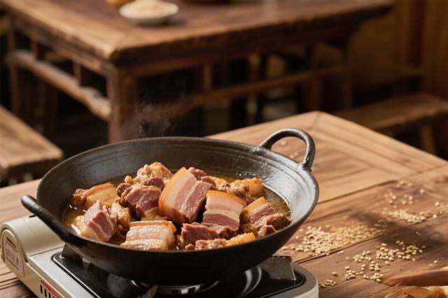 第一滴,煸香打底。五花肉切方塊焯水后,鍋中放少許底油,油溫三成熱時(shí)滴 5ml 學(xué)步橋小磨香油,待油面泛起細(xì)密油花,放入姜片蔥段爆香。香油的煙點(diǎn)低于普通植物油,低溫煸香不易糊,還能讓香料的味道更透徹地滲入油中,為肉塊鋪好 “香氣地基”。