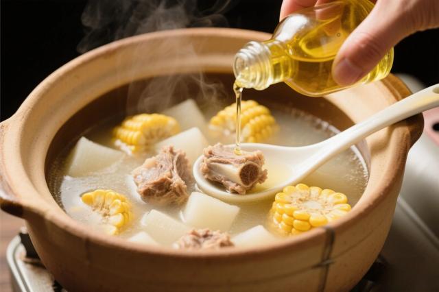 第二步,起鍋增香。湯燉至排骨軟爛后,關(guān)火前 1 分鐘滴 2ml 香油,用湯勺輕輕攪動(dòng)。此時(shí)香油會(huì)在湯面形成一層薄而均勻的油膜,既能防止熱氣過(guò)快散發(fā),又能讓芝麻香與骨香、蘿卜香(或玉米香)充分融合。盛碗時(shí)撒把蔥花,香油的香、蔥花的鮮、排骨的醇,三口就能喝出秋意的溫暖。