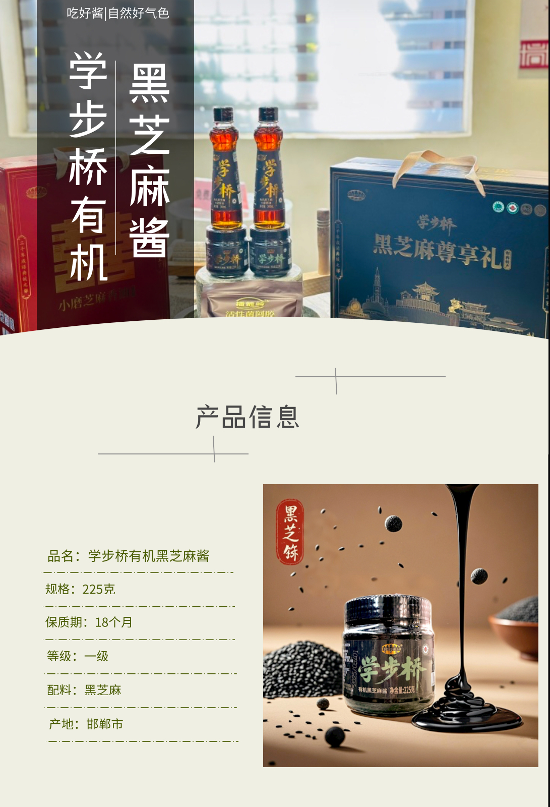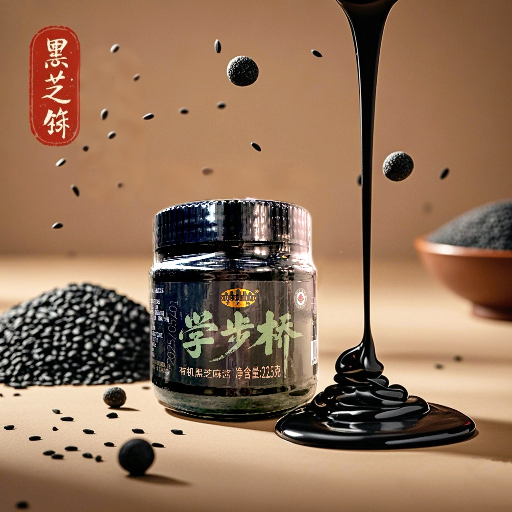 學步橋有機黑芝麻醬,以純粹的有機內核,在香氣與營養間找到了完美平衡。有機種植,顆顆純凈用來磨醬的黑芝麻,來自堅持有機耕作的田間。不撒化肥,只施草木灰與有機肥;不噴農藥,靠人工除草和生物防治守護作物。飽滿的芝麻粒在陽光下積累油脂與養分,采收后經嚴格篩選,只留顆粒均勻、色澤烏亮的果實,從源頭保證每一口的純凈。沿用傳統石磨工藝,低溫慢研鎖住芝麻的本真香氣,開蓋瞬間,濃郁的芝麻香直竄鼻尖,帶著烘烤后的焦香與堅果的醇厚,可用于涂抹面包、拌涼菜、制作甜品等。